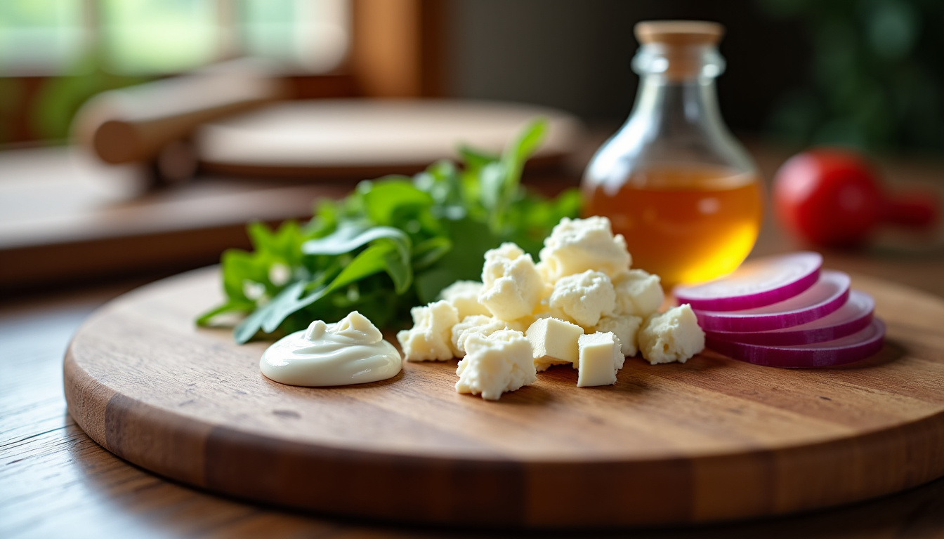 Le fromage de chèvre est l’élément central. Pour une texture optimale, on recommande de choisir une bûche de chèvre affinée mais encore tendre. Cela permet une légère fonte au four tout en conservant sa structure.